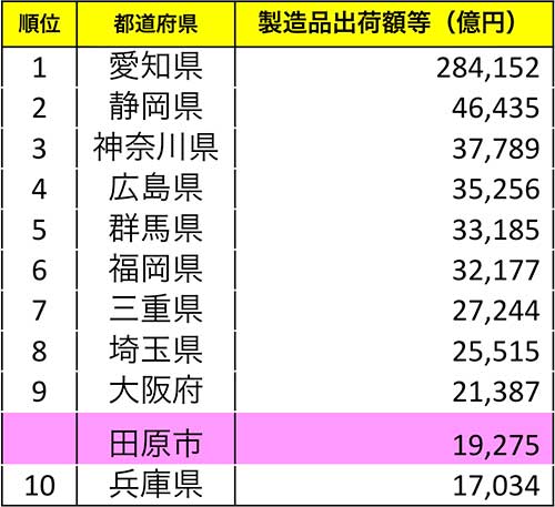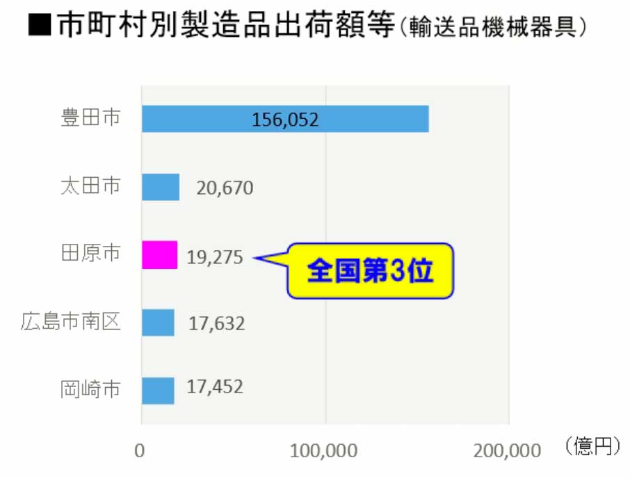 田原市の輸送品機械器具の製造品出荷額等は市町村別で全国3位で、都道府県別上位の1県にも相当し、県内有数の工業集積地となっています。