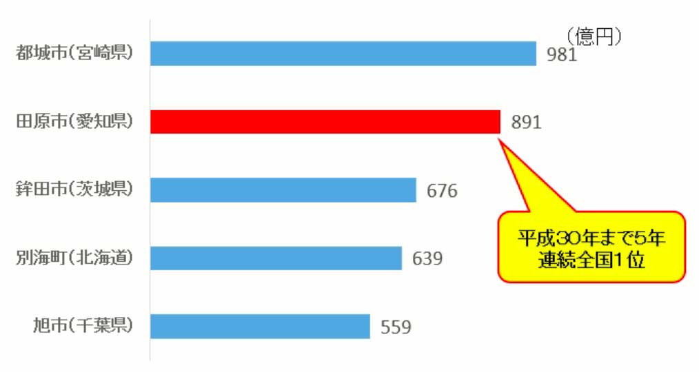 田原市の農業は、昭和43年の豊川用水全面通水以来、飛躍的な発展を遂げ、令和5年の農業産出額は市町村別全国2位となっています。(平成30年まで5年連続全国1位)