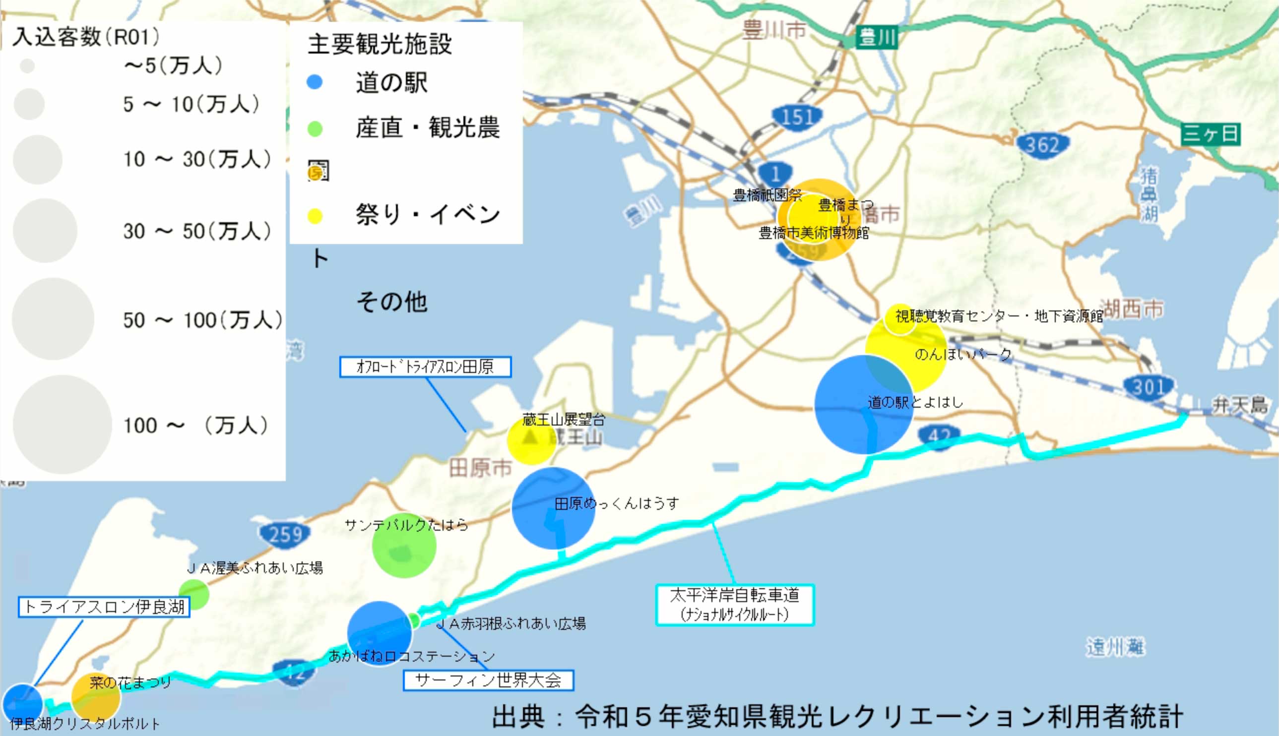 観光レクリエーション利用者統計(レジ数)によると下記図のとおり主要観光施設では、「道の駅」田原めっくんはうすをはじめとする3つの重点「道の駅」、蔵王山展望台や観光農園における季節に応じたメロン・イチゴなどの味覚狩りなどの観光資源が立地しており、年間約230万人が利用されており、令和3年5月には太平洋岸自転車道がナショナルサイクルルート指定を受けています。